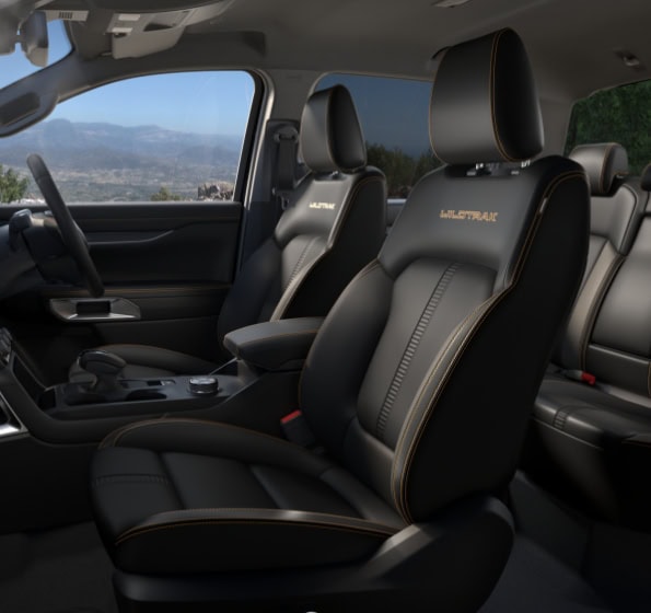 Ranger Wildtrak’s Signature style ensures extreme comfort on any expedition, with ebony interior, terra suede wrap and orange & grey accents.